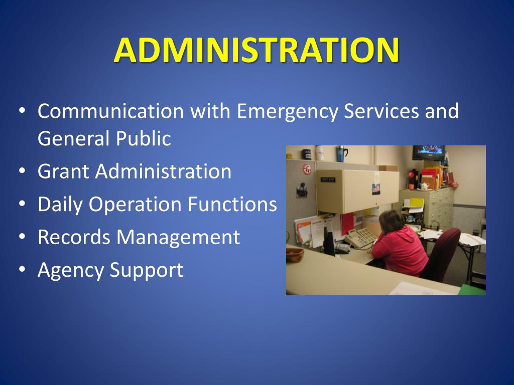 ADMINISTRATION • Communication with Emergency Services and General Public • Grant Administration • Daily Operation Functions • Records Management • Agency Support