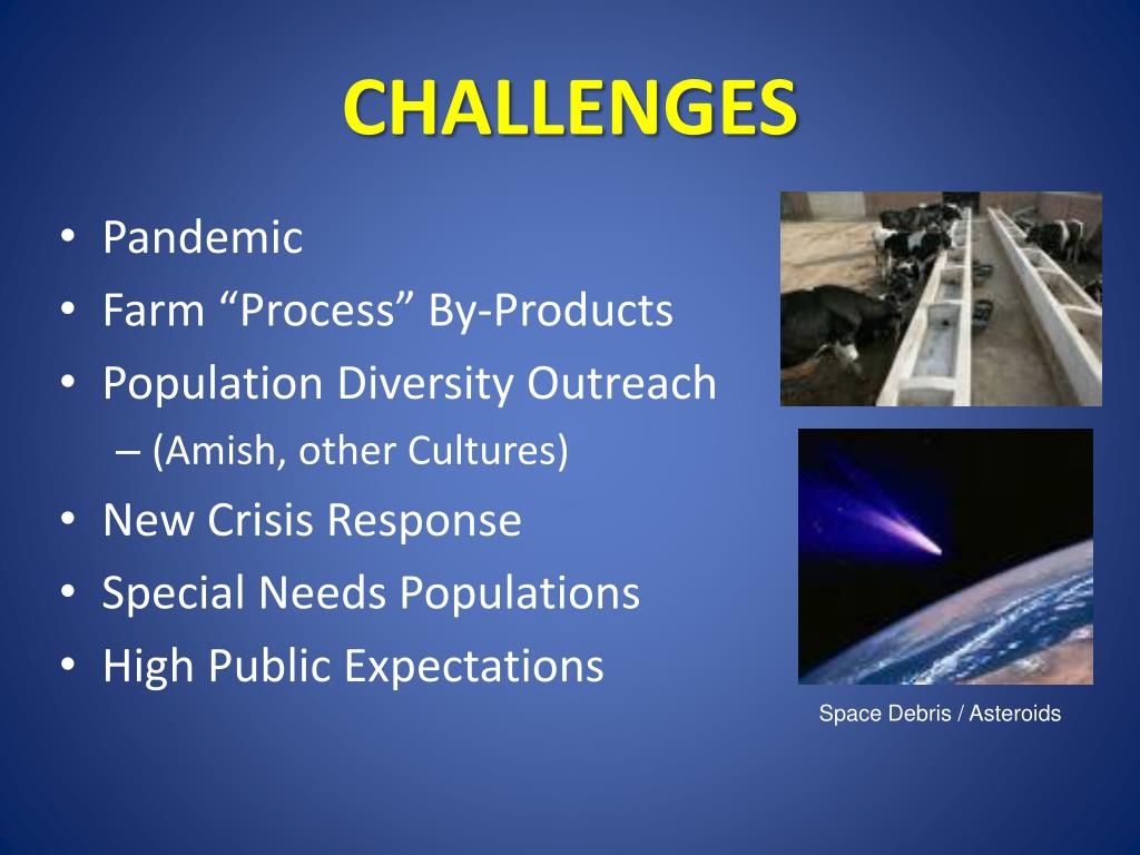 CHALLENGES • Pandemic • Farm “Process” By-Products • Population Diversity Outreach • (Amish, other Cultures) • New Crisis Response • Special Needs Populations • High Public Expectations Space Debris / Asteroids