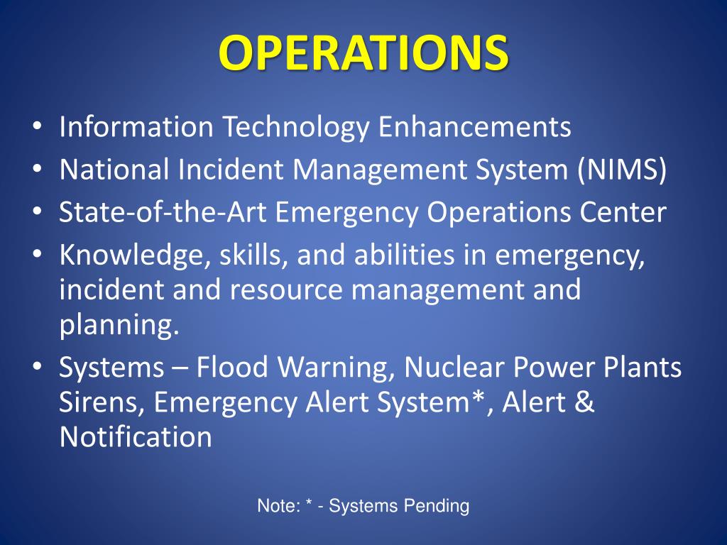 OPERATIONS • Information Technology Enhancements • National Incident Management System (NIMS) • State-of-the-Art Emergency Operations Center • Knowledge, skills, and abilities in emergency, incident and resource management and planning. • Systems – Flood Warning, Nuclear Power Plants Sirens, Emergency Alert System*, Alert & Notification Note: * - Systems Pending