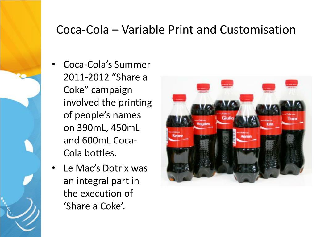 Coca-Cola – Variable Print and Customisation • Coca-Cola’s Summer 2011-2012 “Share a Coke” campaign involved the printing of people’s names on 390mL, 450mL and 600mL Coca-Cola bottles. • Le Mac’s Dotrix was an integral part in the execution of ‘Share a Coke’.
