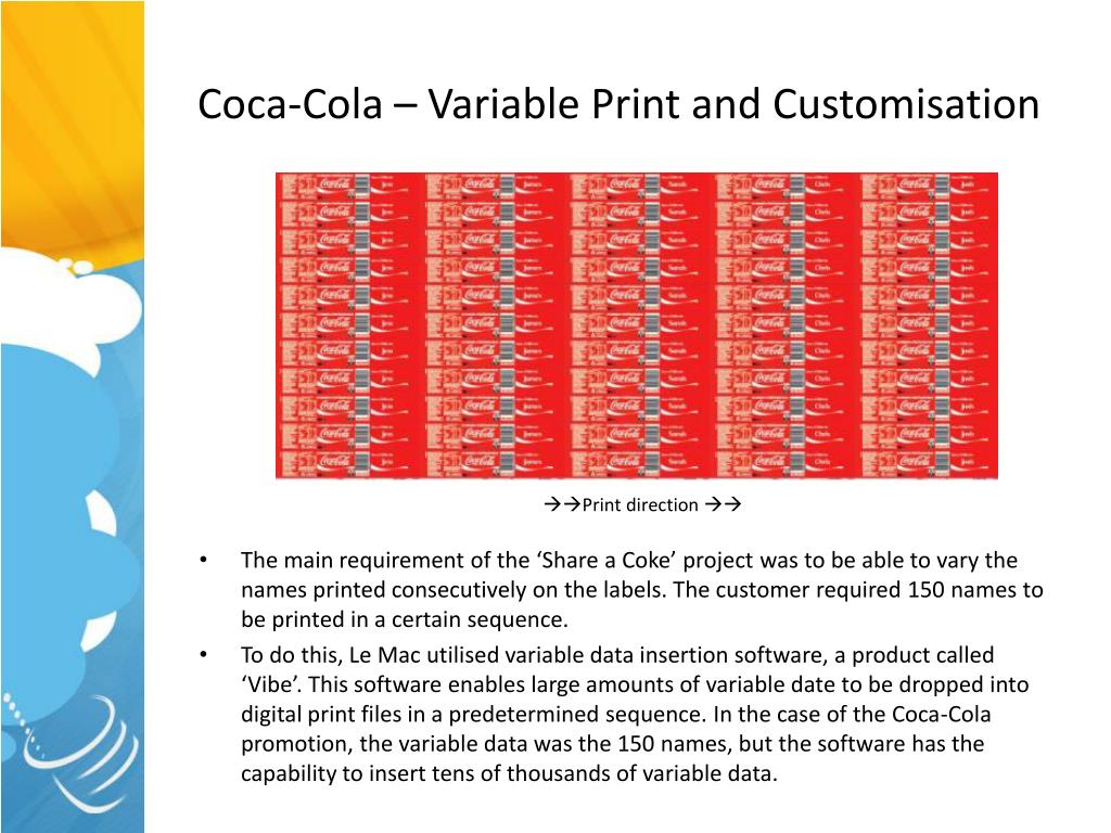 Coca-Cola – Variable Print and Customisation • The main requirement of the ‘Share a Coke’ project was to be able to vary the names printed consecutively on the labels. The customer required 150 names to be printed in a certain sequence. • To do this, Le Mac utilised variable data insertion software, a product called ‘Vibe’. This software enables large amounts of variable date to be dropped into digital print files in a predetermined sequence. In the case of the Coca-Cola promotion, the variable data was the 150 names, but the software has the capability to insert tens of thousands of variable data. Print direction