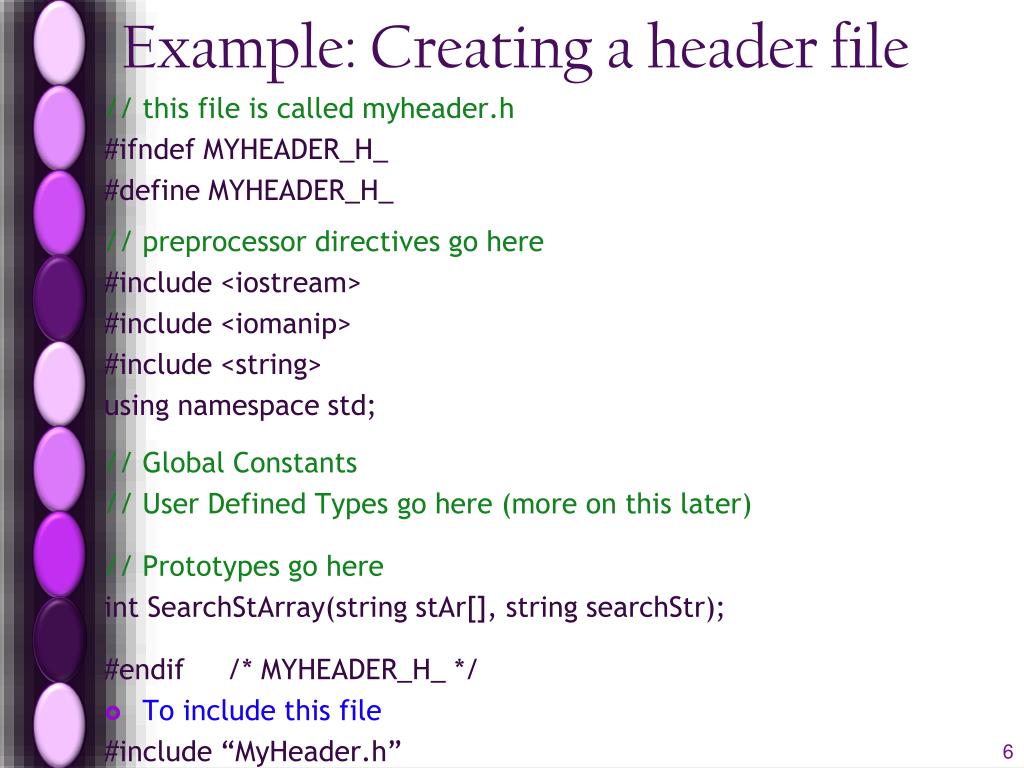 Example: Creating a header file // this file is called myheader.h #ifndef MYHEADER_H_ #define MYHEADER_H_ // preprocessor directives go here #include <iostream> #include <iomanip> #include <string> using namespace std; // Global Constants // User Defined Types go here (more on this later) // Prototypes go here intSearchStArray(string stAr[], string searchStr); #endif /* MYHEADER_H_ */ • To include this file #include “MyHeader.h”