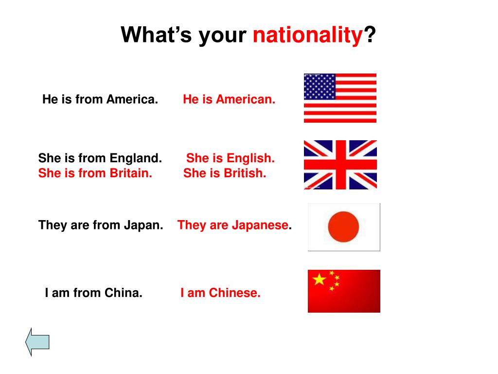 What’s your nationality? He is from America. He is American. She is from England. She is English. She is from Britain. She is British. They are from Japan. They are Japanese. I am from China. I am Chinese.