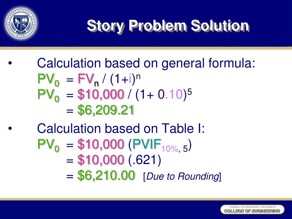 Story Problem Solution • Calculation based on general formula: PV0 = FVn / (1+i)nPV0= $10,000/ (1+ 0.10)5 = $6,209.21 • Calculation based on Table I: PV0= $10,000(PVIF10%, 5)= $10,000(.621) = $6,210.00 [Due to Rounding]