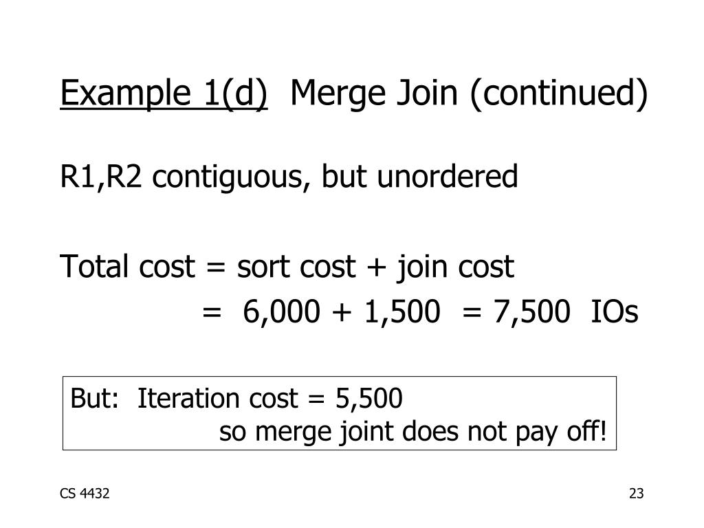 Example 1(d) Merge Join (continued) R1,R2 contiguous, but unordered Total cost = sort cost + join cost = 6,000 + 1,500 = 7,500 IOs But: Iteration cost = 5,500 so merge joint does not pay off!