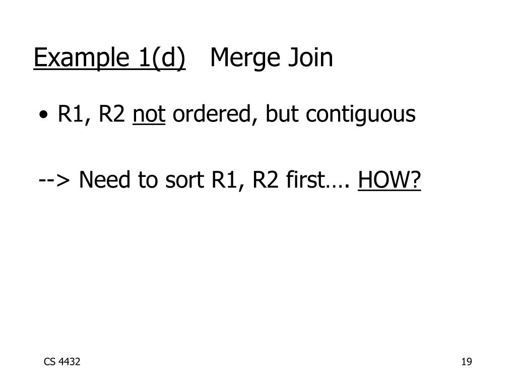 Example 1(d) Merge Join • R1, R2 not ordered, but contiguous --> Need to sort R1, R2 first…. HOW?
