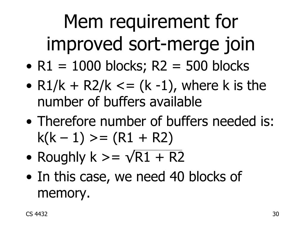 In our example R1 is 1000 blocks, k (k – 1) 1000 gives k >= 33 R2 is 500 blocks, k (k – 1) 500 gives k >= 23 Need at least 33 buffers