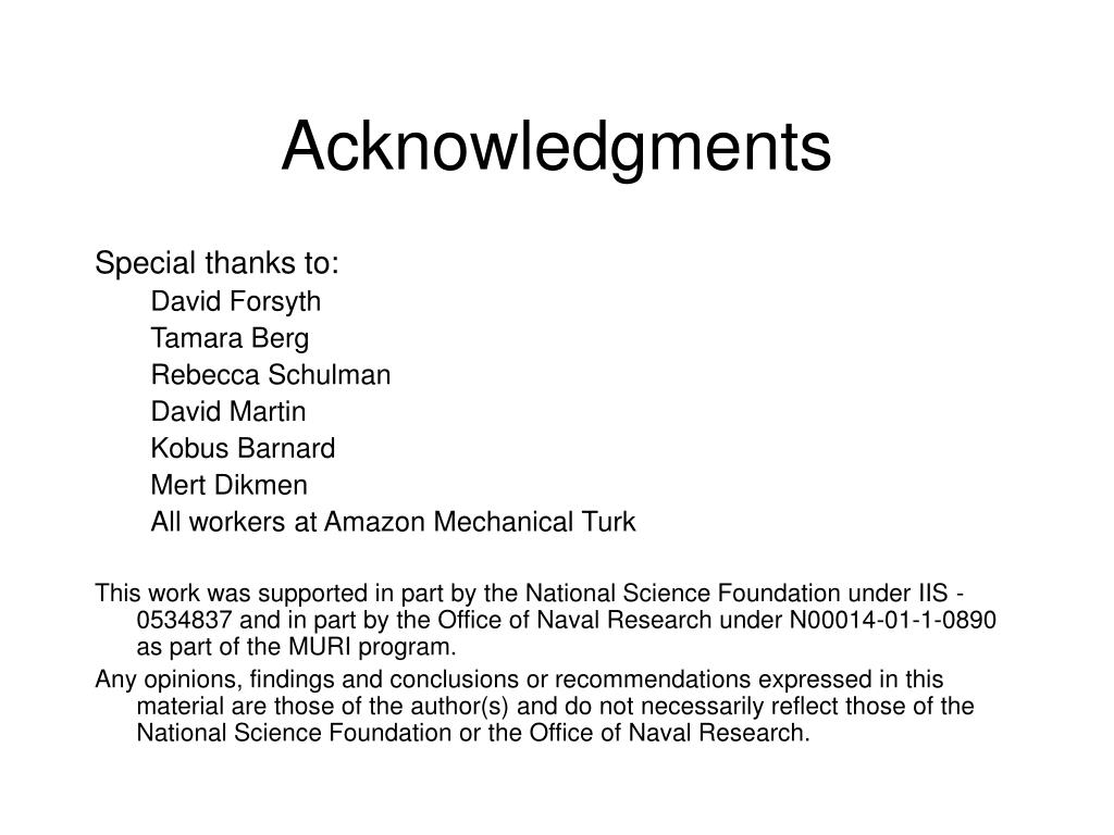 Acknowledgments Special thanks to: David Forsyth Tamara Berg Rebecca Schulman David Martin Kobus Barnard Mert Dikmen All workers at Amazon Mechanical Turk This work was supported in part by the National Science Foundation under IIS - 0534837 and in part by the Office of Naval Research under N00014-01-1-0890 as part of the MURI program. Any opinions, findings and conclusions or recommendations expressed in this material are those of the author(s) and do not necessarily reflect those of the National Science Foundation or the Office of Naval Research.