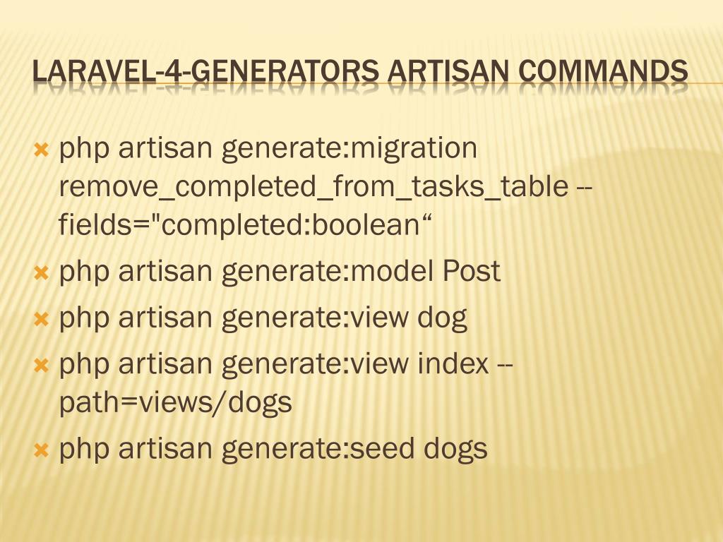 php artisan generate:migrationremove_completed_from_tasks_table --fields="completed:boolean“ php artisan generate:model Post php artisan generate:view dog php artisan generate:view index --path=views/dogs php artisan generate:seed dogs Laravel-4-generators Artisan Commands