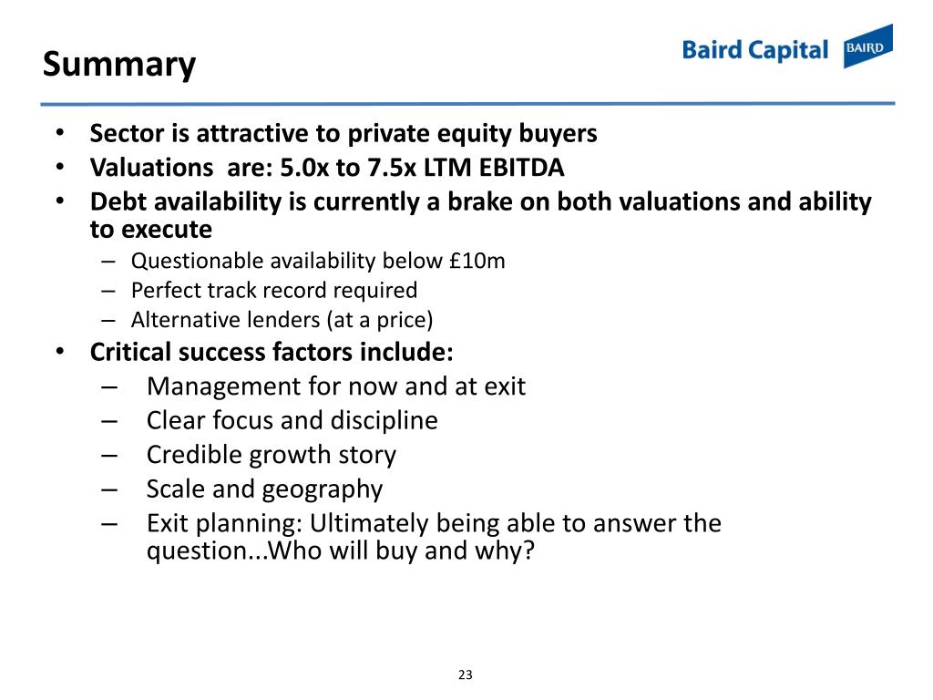 Aston Carter: A Case Study Aston Carter CEO, Sean Zimdahl; “Baird Capital Partners Europe has been a great partner. The team brought deep sector knowledge and investment experience to our business, which really helped us develop the initial growth strategy. Then through tougher markets they were highly supportive of managing the cost base and retaining the key people at a level that enabled the business to grow quickly as markets improved. Their operational expertise and international network was a real help.” Aston Carter Baird US introduced the acquirer of the business • Actions: • Accessed Baird resources to develop strategy for overseas growth and exit • Introduced operating partner John Hubert as non-executive Chair, helped development of senior management structure to aid international development • Incentivised the senior managers to drive continued growth • Significantly improved MIS reporting and financial/cash management to support growth • Baird US introduced the acquirer of the business • Results: • Geographic expansion (Netherlands, Singapore, Hong Kong, UK, France, Sweden) • Built the customer base significantly by further penetrating core FS sector customers, developing new customers and growing consulting/corporate accounts • Paid debt down c. 40% • Rapid execution of strategy supported the business in the recession and has enabled rapid profit growth early in the recovery ‘2012 Mid-Market Management Team of the Year’ Value Creation (£ in millions) 22