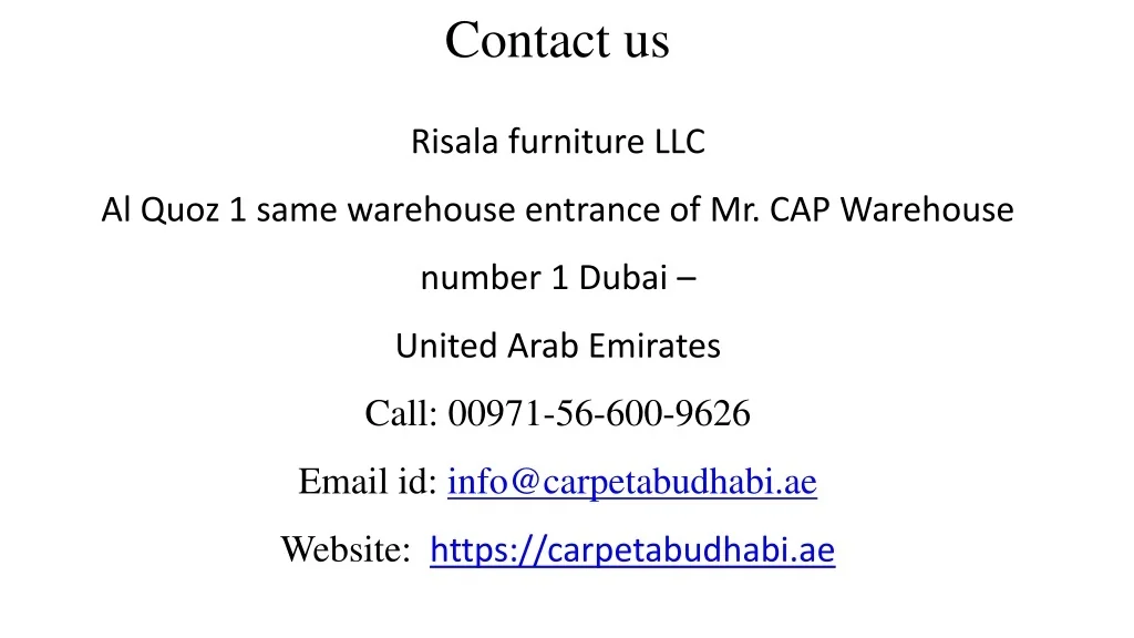 Risala furniture LLC Al Quoz 1 same warehouse entrance of Mr. CAP Warehouse number 1 Dubai – United Arab Emirates Call: 00971-56-600-9626 Email id: info@carpetabudhabi.ae Website: https://carpetabudhabi.ae Contact us
