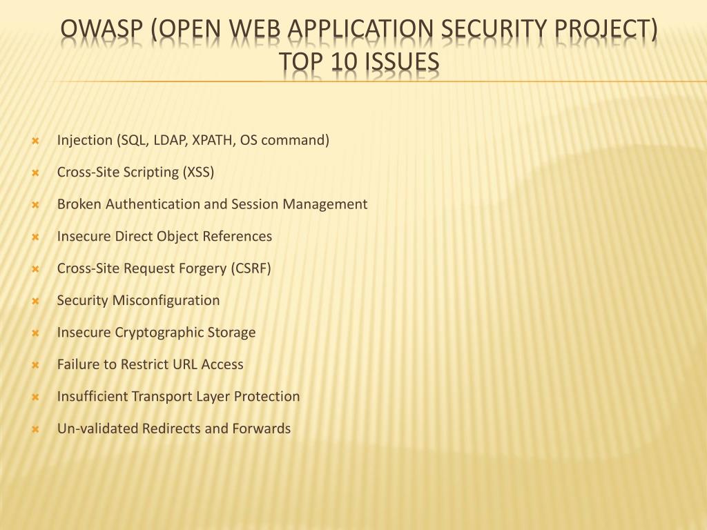 Injection (SQL, LDAP, XPATH, OS command) Cross-Site Scripting (XSS) Broken Authentication and Session Management Insecure Direct Object References Cross-Site Request Forgery (CSRF) Security Misconfiguration Insecure Cryptographic Storage Failure to Restrict URL Access Insufficient Transport Layer Protection Un-validated Redirects and Forwards OWAsP (open web application security project) TOP 10 ISSUES