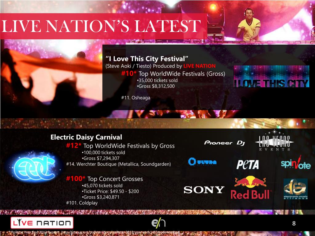 LIVE NATION’S LATEST • “I Love This City Festival” • (Steve Aoki / Tiesto) Produced by LIVE NATION #10* Top WorldWide Festivals (Gross) • 35,000 tickets sold • Gross $8,312,500 • #11. Osheaga • Electric Daisy Carnival • #12* Top WorldWide Festivals by Gross • 100,000 tickets sold • Gross $7,294,307 • #14. Werchter Boutique (Metallica, Soundgarden) • #100* Top Concert Grosses • 45,070 tickets sold • Ticket Price: $49.50 - $200 • Gross $3,240,871 • #101. Coldplay * Pollstar Year End 2012 Report: http://issuu.com/pollstar/docs/pollstar-2012-year-end-1-2?mode=embed
