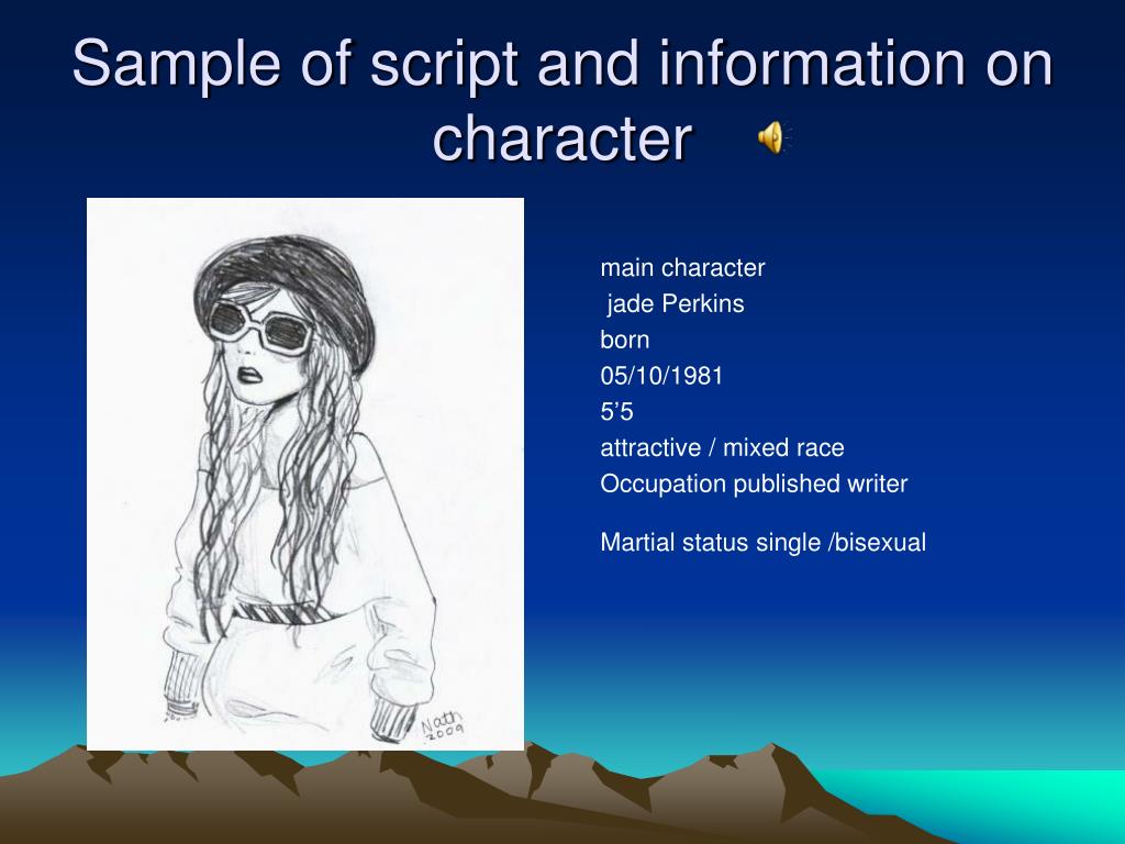 Sample of script and information on character main character jade Perkins born 05/10/1981 5’5 attractive / mixed race Occupation published writer Martial status single /bisexual