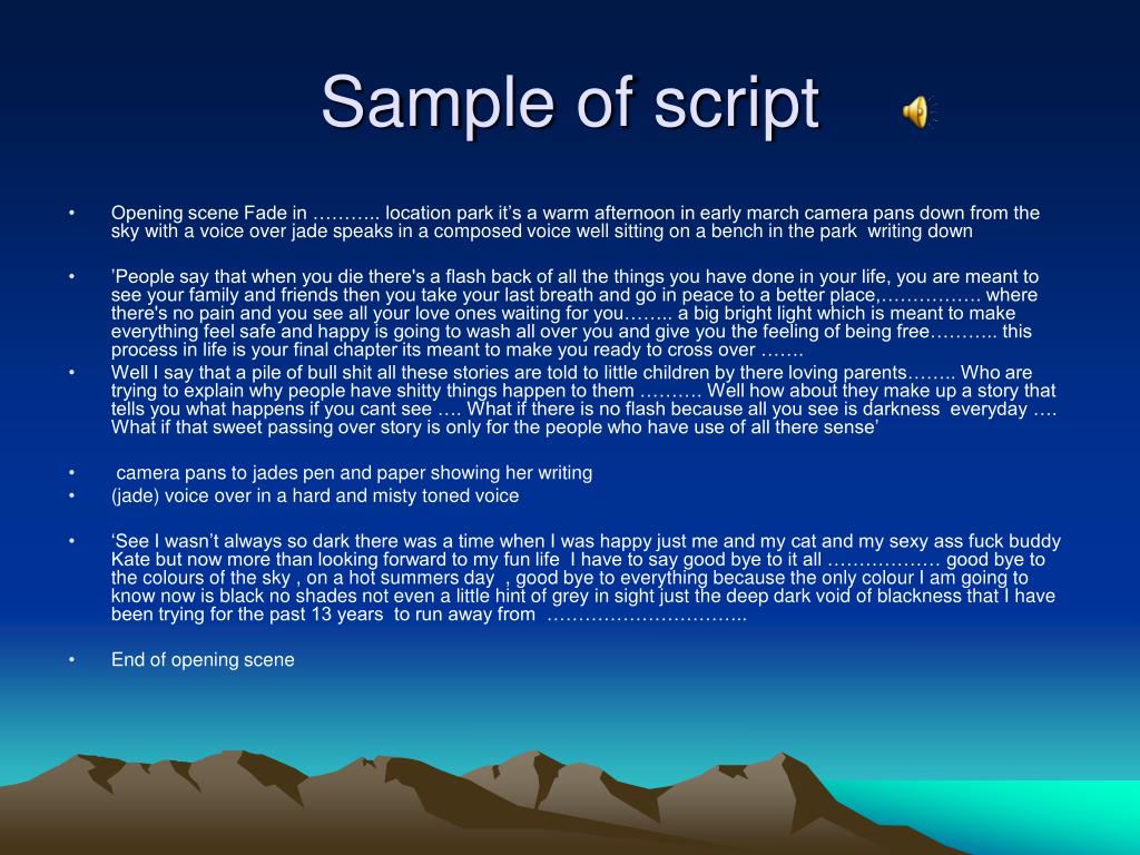 Sample of script • Opening scene Fade in ……….. location park it’s a warm afternoon in early march camera pans down from the sky with a voice over jade speaks in a composed voice well sitting on a bench in the park writing down • ’People say that when you die there's a flash back of all the things you have done in your life, you are meant to see your family and friends then you take your last breath and go in peace to a better place,……………. where there's no pain and you see all your love ones waiting for you…….. a big bright light which is meant to make everything feel safe and happy is going to wash all over you and give you the feeling of being free……….. this process in life is your final chapter its meant to make you ready to cross over ……. • Well I say that a pile of bull shit all these stories are told to little children by there loving parents…….. Who are trying to explain why people have shitty things happen to them ………. Well how about they make up a story that tells you what happens if you cant see …. What if there is no flash because all you see is darkness everyday …. What if that sweet passing over story is only for the people who have use of all there sense’ • camera pans to jades pen and paper showing her writing • (jade) voice over in a hard and misty toned voice • ‘See I wasn’t always so dark there was a time when I was happy just me and my cat and my sexy ass fuck buddy Kate but now more than looking forward to my fun life I have to say good bye to it all ……………… good bye to the colours of the sky , on a hot summers day , good bye to everything because the only colour I am going to know now is black no shades not even a little hint of grey in sight just the deep dark void of blackness that I have been trying for the past 13 years to run away from ………………………….. • End of opening scene