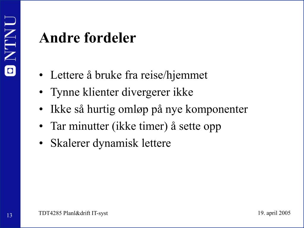 Andre fordeler • Lettere å bruke fra reise/hjemmet • Tynne klienter divergerer ikke • Ikke så hurtig omløp på nye komponenter • Tar minutter (ikke timer) å sette opp • Skalerer dynamisk lettere TDT4285 Planl&drift IT-syst