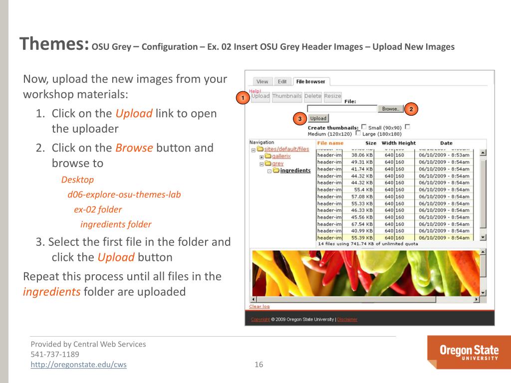 Themes: OSU Grey – Configuration – Ex. 02 Insert OSU Grey Header Images – Upload New Images • Now, upload the new images from your workshop materials: • Click on the Upload link to open the uploader • Click on the Browse button and browse to Desktop d06-explore-osu-themes-lab ex-02 folder ingredients folder 3. Select the first file in the folder and click the Upload button • Repeat this process until all files in the ingredients folder are uploaded 1 2 3