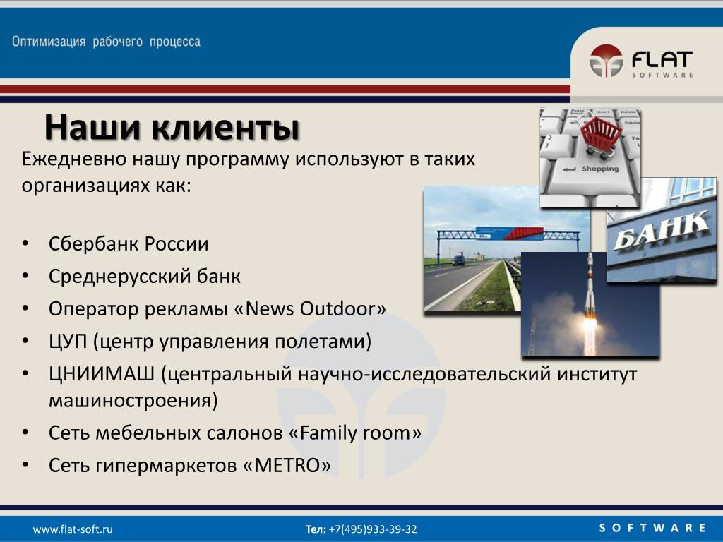 Наши клиенты Ежедневно нашу программу используют в таких организациях как: • Сбербанк России • Среднерусский банк • Оператор рекламы «News Outdoor» • ЦУП (центр управления полетами) • ЦНИИМАШ (центральный научно-исследовательский институт машиностроения) • Сеть мебельных салонов «Family room» • Сеть гипермаркетов «METRO» Тел: +7(495)933-39-32