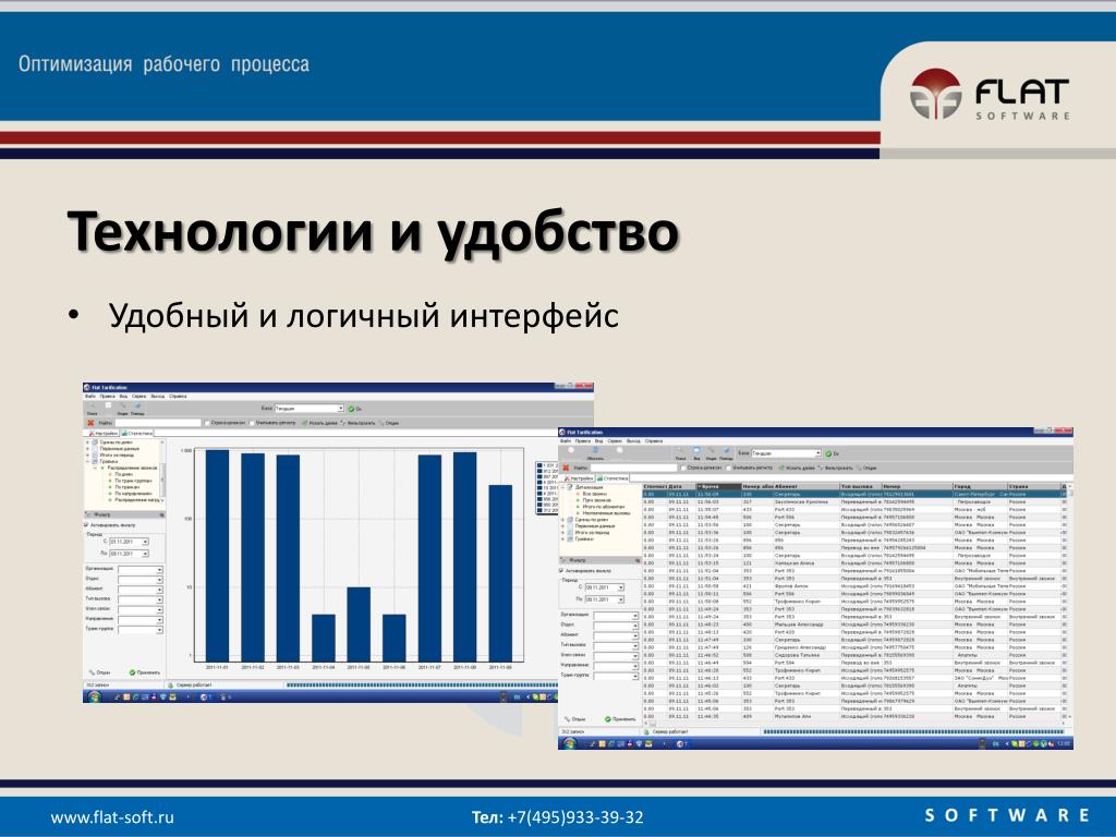 Система « Тарификация» «FLATТарификация» - многофункциональный программный комплекс билинга, статистики, мониторинга и управления, который помогает сделать работу команды сотрудников более отлаженной и эффективной, а так же предоставляет руководству компании удобный инструмент для контроля и управления рабочими процессами. Тел: +7(495)933-39-32