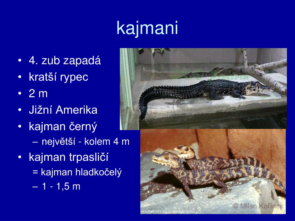 kajmani • 4. zub zapadá • kratší rypec • 2 m • Jižní Amerika • kajman černý • největší - kolem 4 m • kajman trpasličí = kajman hladkočelý • 1 - 1,5 m