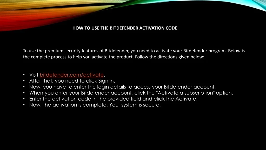 HOW TO USE THE BITDEFENDER ACTIVATION CODE To use the premium security features of Bitdefender, you need to activate your Bitdefender program. Below is the complete process to help you activate the product. Follow the directions given below: Visit bitdefender.com/activate. After that, you need to click Sign in. Now, you have to enter the login details to access your Bitdefender account. When you enter your Bitdefender account, click the "Activate a subscription" option. Enter the activation code in the provided field and click the Activate. Now, the activation is complete. Your system is secure. • • • • • •