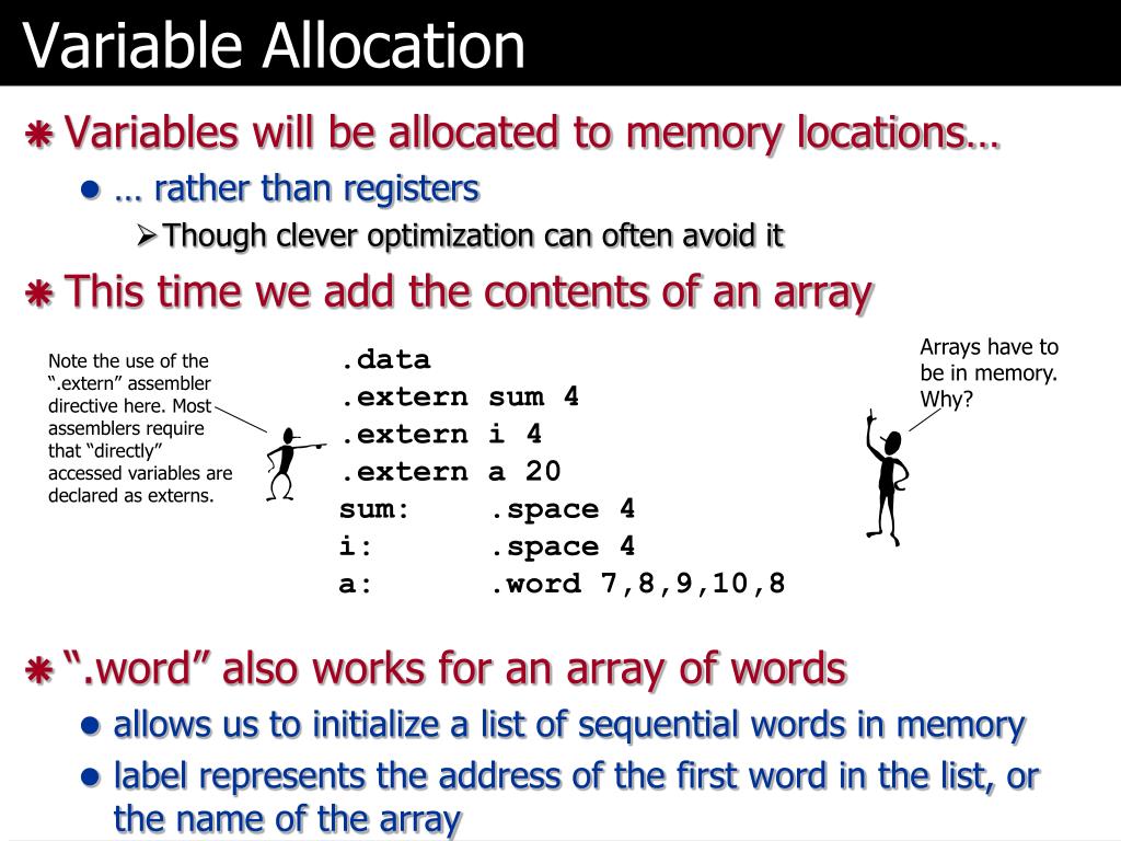 Variable Allocation Arrays have to be in memory. Why? Note the use of the “.extern” assembler directive here. Most assemblers require that “directly” accessed variables are declared as externs. • Variables will be allocated to memory locations… • … rather than registers • Though clever optimization can often avoid it • This time we add the contents of an array • “.word” also works for an array of words • allows us to initialize a list of sequential words in memory • label represents the address of the first word in the list, or the name of the array .data .extern sum 4 .extern i 4 .extern a 20 sum: .space 4 i: .space 4 a: .word 7,8,9,10,8