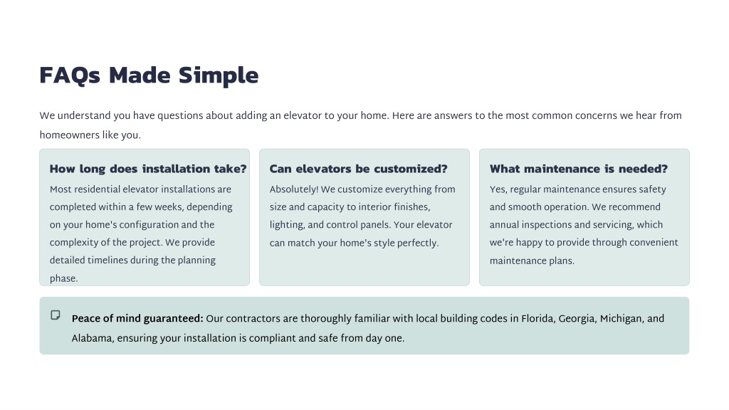 FAQs Made Simple We understand you have questions about adding an elevator to your home. Here are answers to the most common concerns we hear from homeowners like you. How long does installation take? Can elevators be customized? What maintenance is needed? Most residential elevator installations are completed within a few weeks, depending on your home's configuration and the complexity of the project. We provide detailed timelines during the planning phase. Absolutely! We customize everything from size and capacity to interior finishes, lighting, and control panels. Your elevator can match your home's style perfectly. Yes, regular maintenance ensures safety and smooth operation. We recommend annual inspections and servicing, which we're happy to provide through convenient maintenance plans. Peace of mind guaranteed: Our contractors are thoroughly familiar with local building codes in Florida, Georgia, Michigan, and Alabama, ensuring your installation is compliant and safe from day one.