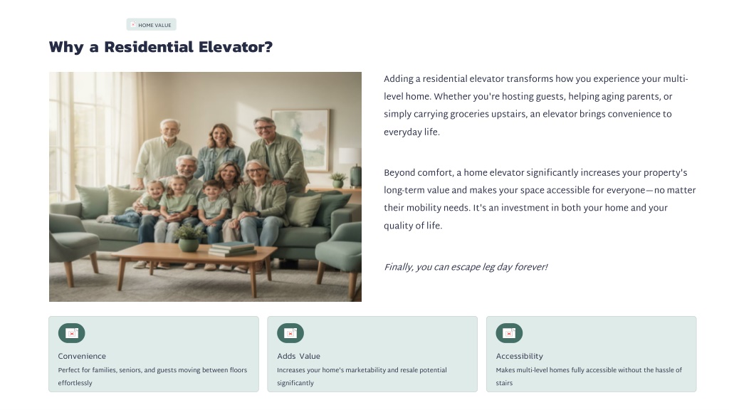 HOME VALUE Why a Residential Elevator? Adding a residential elevator transforms how you experience your multi-level home. Whether you're hosting guests, helping aging parents, or simply carrying groceries upstairs, an elevator brings convenience to everyday life. Beyond comfort, a home elevator significantly increases your property's long-term value and makes your space accessible for everyone—no matter their mobility needs. It's an investment in both your home and your quality of life. Finally, you can escape leg day forever! Convenience Adds Value Accessibility Perfect for families, seniors, and guests moving between floors effortlessly Increases your home's marketability and resale potential significantly Makes multi-level homes fully accessible without the hassle of stairs
