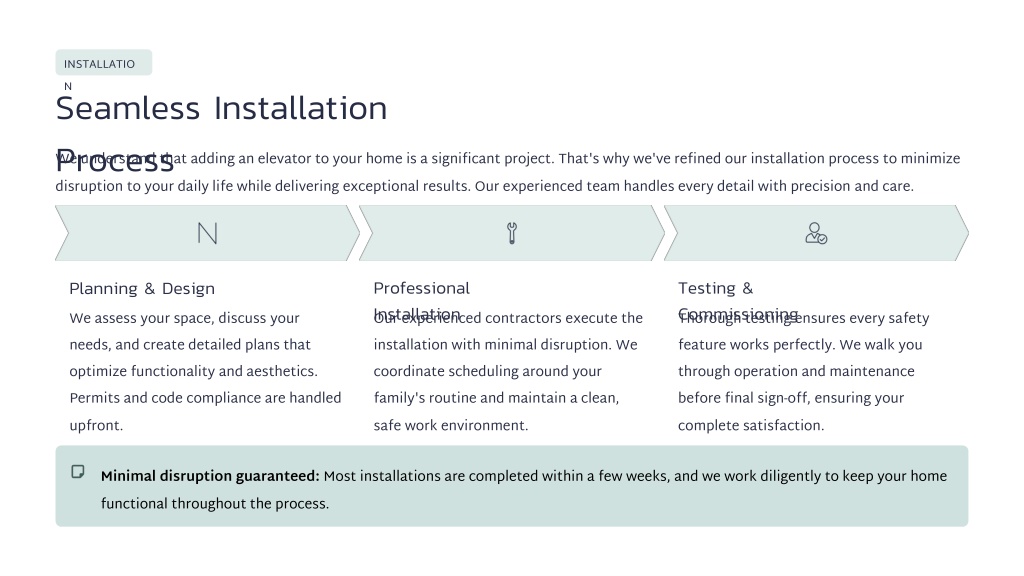 INSTALLATION Seamless Installation Process We understand that adding an elevator to your home is a significant project. That's why we've refined our installation process to minimize disruption to your daily life while delivering exceptional results. Our experienced team handles every detail with precision and care. Planning & Design Professional Installation Testing & Commissioning We assess your space, discuss your needs, and create detailed plans that optimize functionality and aesthetics. Permits and code compliance are handled upfront. Our experienced contractors execute the installation with minimal disruption. We coordinate scheduling around your family's routine and maintain a clean, safe work environment. Thorough testing ensures every safety feature works perfectly. We walk you through operation and maintenance before final sign-off, ensuring your complete satisfaction. Minimal disruption guaranteed: Most installations are completed within a few weeks, and we work diligently to keep your home functional throughout the process.