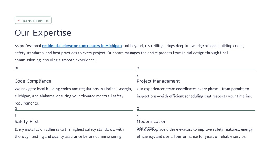 LICENSED EXPERTS Our Expertise As professional residential elevator contractors in Michigan and beyond, DK Drilling brings deep knowledge of local building codes, safety standards, and best practices to every project. Our team manages the entire process from initial design through final commissioning, ensuring a smooth experience. 01 02 Code Compliance Project Management We navigate local building codes and regulations in Florida, Georgia, Michigan, and Alabama, ensuring your elevator meets all safety requirements. Our experienced team coordinates every phase—from permits to inspections—with efficient scheduling that respects your timeline. 03 04 Safety First Modernization Services Every installation adheres to the highest safety standards, with thorough testing and quality assurance before commissioning. We also upgrade older elevators to improve safety features, energy efficiency, and overall performance for years of reliable service.