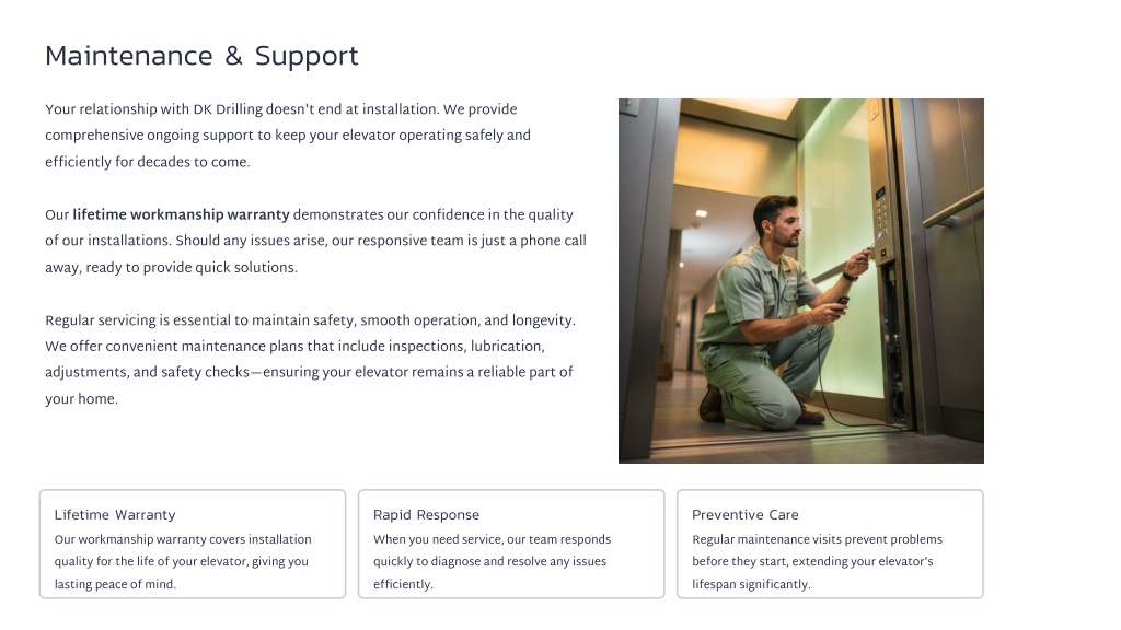 Maintenance & Support Your relationship with DK Drilling doesn't end at installation. We provide comprehensive ongoing support to keep your elevator operating safely and efficiently for decades to come. Our lifetime workmanship warranty demonstrates our confidence in the quality of our installations. Should any issues arise, our responsive team is just a phone call away, ready to provide quick solutions. Regular servicing is essential to maintain safety, smooth operation, and longevity. We offer convenient maintenance plans that include inspections, lubrication, adjustments, and safety checks—ensuring your elevator remains a reliable part of your home. Lifetime Warranty Rapid Response Preventive Care Our workmanship warranty covers installation quality for the life of your elevator, giving you lasting peace of mind. When you need service, our team responds quickly to diagnose and resolve any issues efficiently. Regular maintenance visits prevent problems before they start, extending your elevator's lifespan significantly.