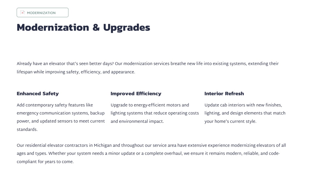 MODERNIZATION Modernization & Upgrades Already have an elevator that's seen better days? Our modernization services breathe new life into existing systems, extending their lifespan while improving safety, efficiency, and appearance. Enhanced Safety Improved Efficiency Interior Refresh Add contemporary safety features like emergency communication systems, backup power, and updated sensors to meet current standards. Upgrade to energy-efficient motors and lighting systems that reduce operating costs and environmental impact. Update cab interiors with new finishes, lighting, and design elements that match your home's current style. Our residential elevator contractors in Michigan and throughout our service area have extensive experience modernizing elevators of all ages and types. Whether your system needs a minor update or a complete overhaul, we ensure it remains modern, reliable, and code-compliant for years to come.