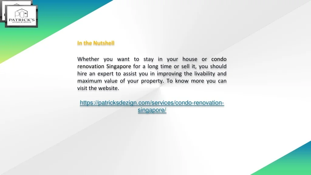In the Nutshell Whether you want to stay in your house or condo renovation Singapore for a long time or sell it, you should hire an expert to assist you in improving the livability and maximum value of your property. To know more you can visit the website. https://patricksdezign.com/services/condo-renovation- singapore/