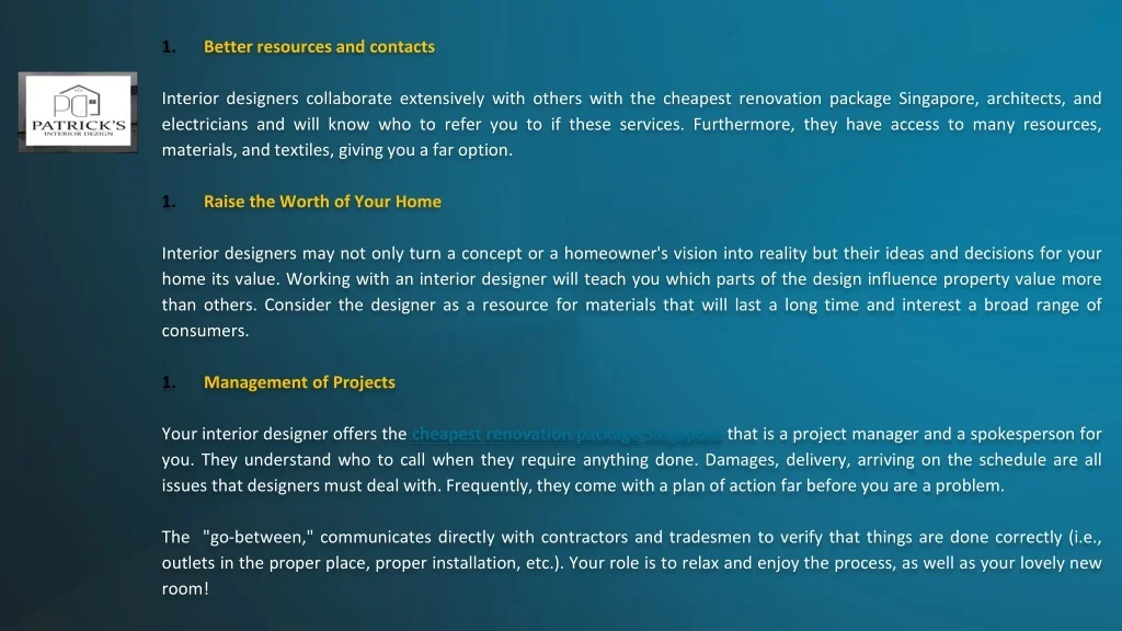 1. Better resources and contacts “ Interior designers collaborate extensively with others with the cheapest renovation package Singapore, architects, and electricians and will know who to refer you to if these services. Furthermore, they have access to many resources, materials, and textiles, giving you a far option. 1. Raise the Worth of Your Home Interior designers may not only turn a concept or a homeowner's vision into reality but their ideas and decisions for your home its value. Working with an interior designer will teach you which parts of the design influence property value more than others. Consider the designer as a resource for materials that will last a long time and interest a broad range of consumers. 1. Management of Projects Your interior designer offers the cheapest renovation package Singapore that is a project manager and a spokesperson for you. They understand who to call when they require anything done. Damages, delivery, arriving on the schedule are all issues that designers must deal with. Frequently, they come with a plan of action far before you are a problem. The "go-between," communicates directly with contractors and tradesmen to verify that things are done correctly (i.e., outlets in the proper place, proper installation, etc.). Your role is to relax and enjoy the process, as well as your lovely new room!