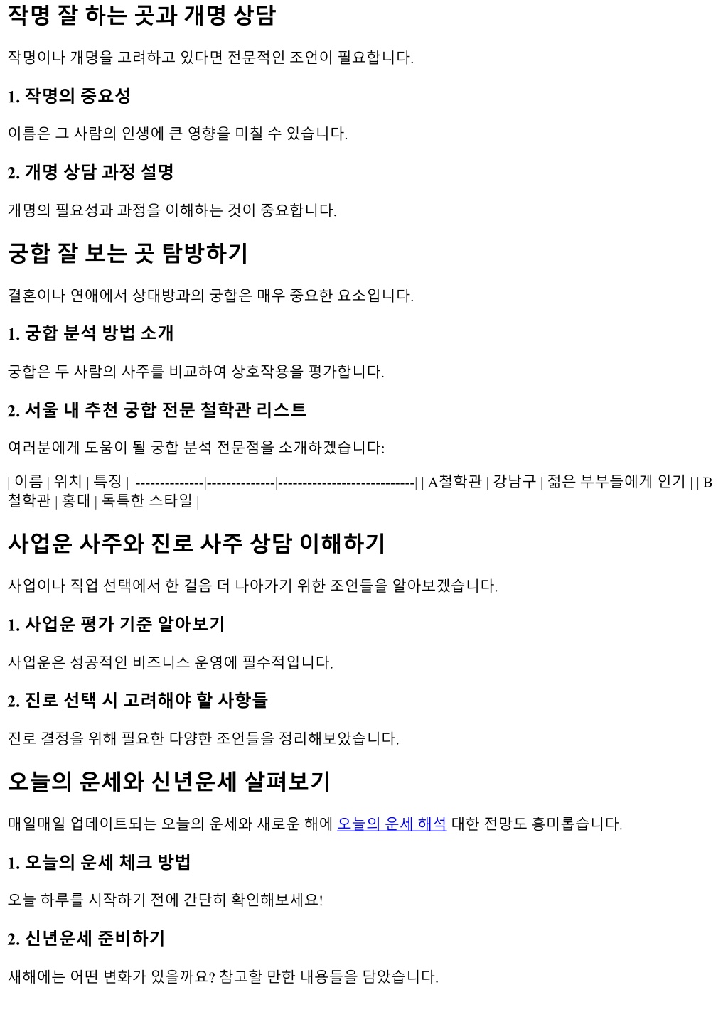 2. 작명잘하는곳과개명상담 작명이나개명을고려하고있다면전문적인조언이필요합니다. 1. 작명의중요성 이름은그사람의인생에큰영향을미칠수있습니다. 2. 개명상담과정설명 개명의필요성과과정을이해하는것이중요합니다. 궁합잘보는곳탐방하기 결혼이나연애에서상대방과의궁합은매우중요한요소입니다. 1. 궁합분석방법소개 궁합은두사람의사주를비교하여상호작용을평가합니다. 2. 서울내추천궁합전문철학관리스트 여러분에게도움이될궁합분석전문점을소개하겠습니다: | 이름 | 위치 | 특징 | |--------------|--------------|----------------------------| | A철학관 | 강남구 | 젊은부부들에게인기 | | B 철학관 | 홍대 | 독특한스타일 | 사업운사주와진로사주상담이해하기 사업이나직업선택에서한걸음더나아가기위한조언들을알아보겠습니다. 1. 사업운평가기준알아보기 사업운은성공적인비즈니스운영에필수적입니다. 2. 진로선택시고려해야할사항들 진로결정을위해필요한다양한조언들을정리해보았습니다. 오늘의운세와신년운세살펴보기 매일매일업데이트되는오늘의운세와새로운해에오늘의운세해석대한전망도흥미롭습니다. 1. 오늘의운세체크방법 오늘하루를시작하기전에간단히확인해보세요! 2. 신년운세준비하기 새해에는어떤변화가있을까요? 참고할만한내용들을담았습니다.