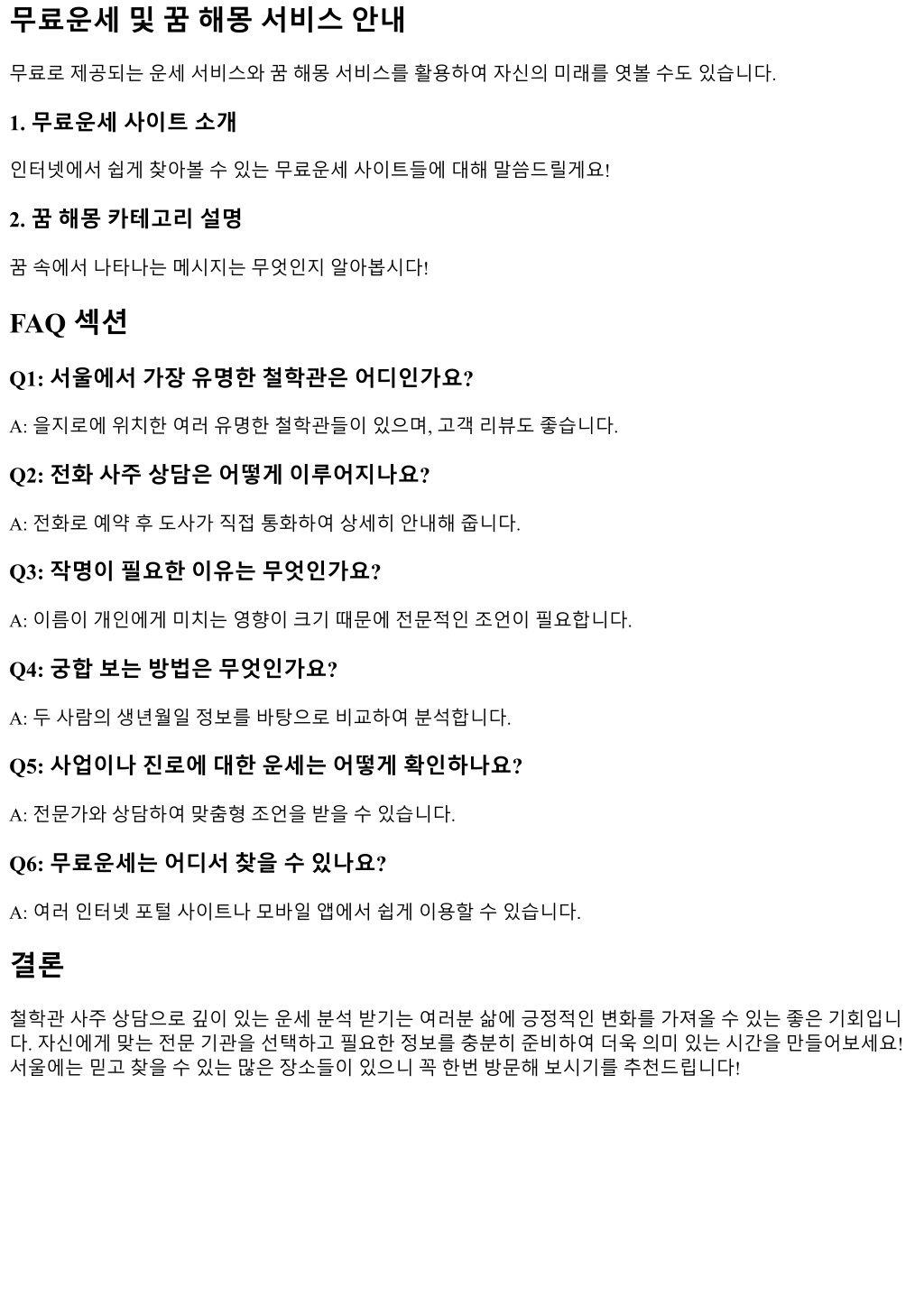 3. 무료운세및꿈해몽서비스안내 무료로제공되는운세서비스와꿈해몽서비스를활용하여자신의미래를엿볼수도있습니다. 1. 무료운세사이트소개 인터넷에서쉽게찾아볼수있는무료운세사이트들에대해말씀드릴게요! 2. 꿈해몽카테고리설명 꿈속에서나타나는메시지는무엇인지알아봅시다! FAQ 섹션 Q1: 서울에서가장유명한철학관은어디인가요? A: 을지로에위치한여러유명한철학관들이있으며, 고객리뷰도좋습니다. Q2: 전화사주상담은어떻게이루어지나요? A: 전화로예약후도사가직접통화하여상세히안내해줍니다. Q3: 작명이필요한이유는무엇인가요? A: 이름이개인에게미치는영향이크기때문에전문적인조언이필요합니다. Q4: 궁합보는방법은무엇인가요? A: 두사람의생년월일정보를바탕으로비교하여분석합니다. Q5: 사업이나진로에대한운세는어떻게확인하나요? A: 전문가와상담하여맞춤형조언을받을수있습니다. Q6: 무료운세는어디서찾을수있나요? A: 여러인터넷포털사이트나모바일앱에서쉽게이용할수있습니다. 결론 철학관사주상담으로깊이있는운세분석받기는여러분삶에긍정적인변화를가져올수있는좋은기회입니 다. 자신에게맞는전문기관을선택하고필요한정보를충분히준비하여더욱의미있는시간을만들어보세요! 서울에는믿고찾을수있는많은장소들이있으니꼭한번방문해보시기를추천드립니다!