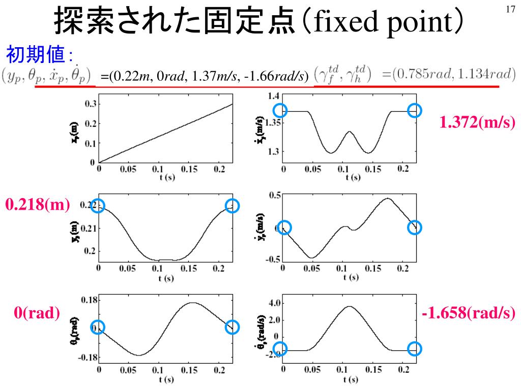 探索された固定点(fixed point) 初期値: =(0.22m, 0rad, 1.37m/s, -1.66rad/s) 1.372(m/s) 0.218(m) 0(rad) -1.658(rad/s)