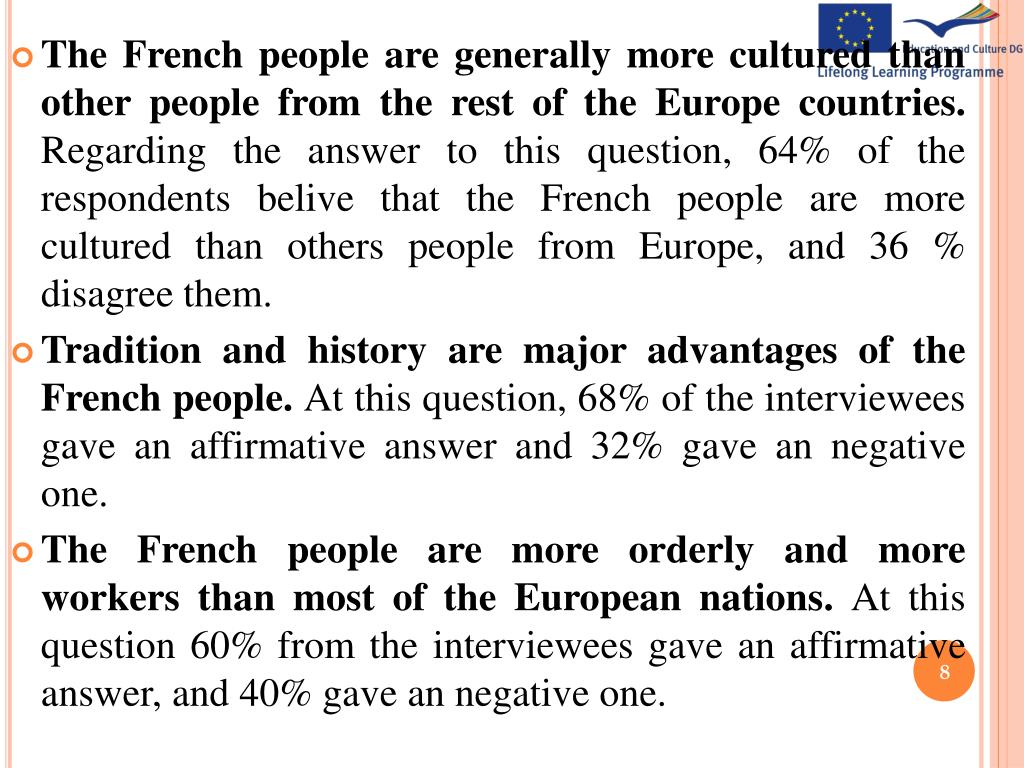 The French people are generally more cultured than other people from the rest of the Europe countries. Regarding the answer to this question, 64% of the respondents belive that the French people are more cultured than others people from Europe, and 36 % disagree them. • Tradition and history are major advantages of the French people. At this question, 68% of the interviewees gave an affirmative answer and 32% gave an negative one. • The French people are more orderly and more workers than most of the European nations.At this question 60% from the interviewees gave an affirmative answer, and 40% gave an negative one.