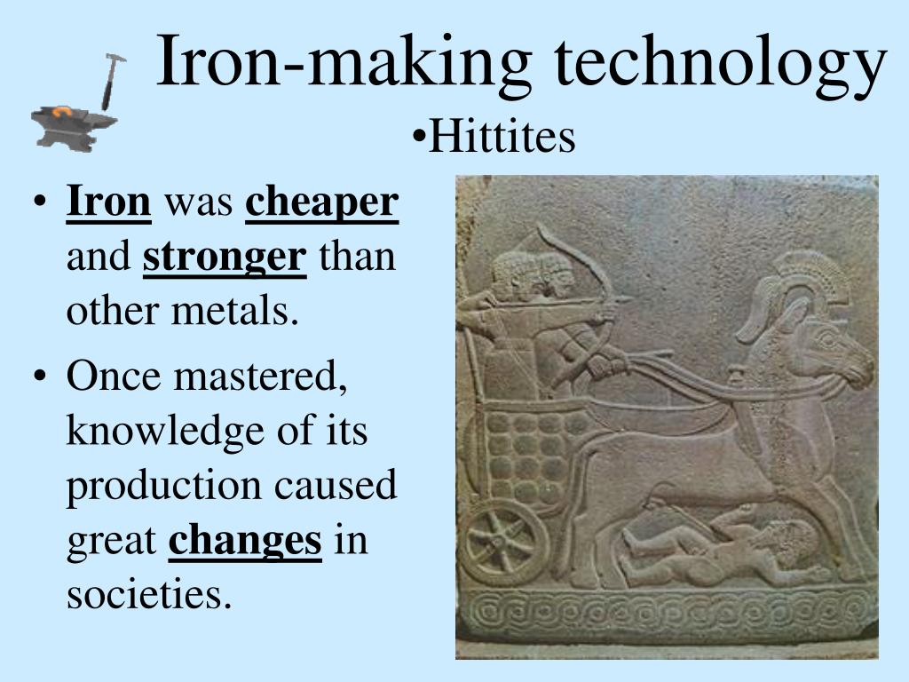 Iron-making technology • Hittites • Ironwas cheaperand stronger than other metals. • Once mastered, knowledge of its production caused great changes in societies.