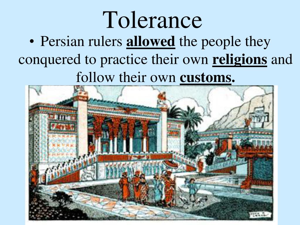 Tolerance • Persian rulers allowed the people they conquered to practice their own religions and follow their own customs.