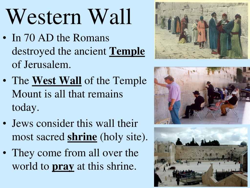 Western Wall • In 70 AD the Romans destroyed the ancient Temple of Jerusalem. • The West Wall of the Temple Mount is all that remains today. • Jews consider this wall their most sacred shrine(holy site). • They come from all over the world to prayat this shrine.