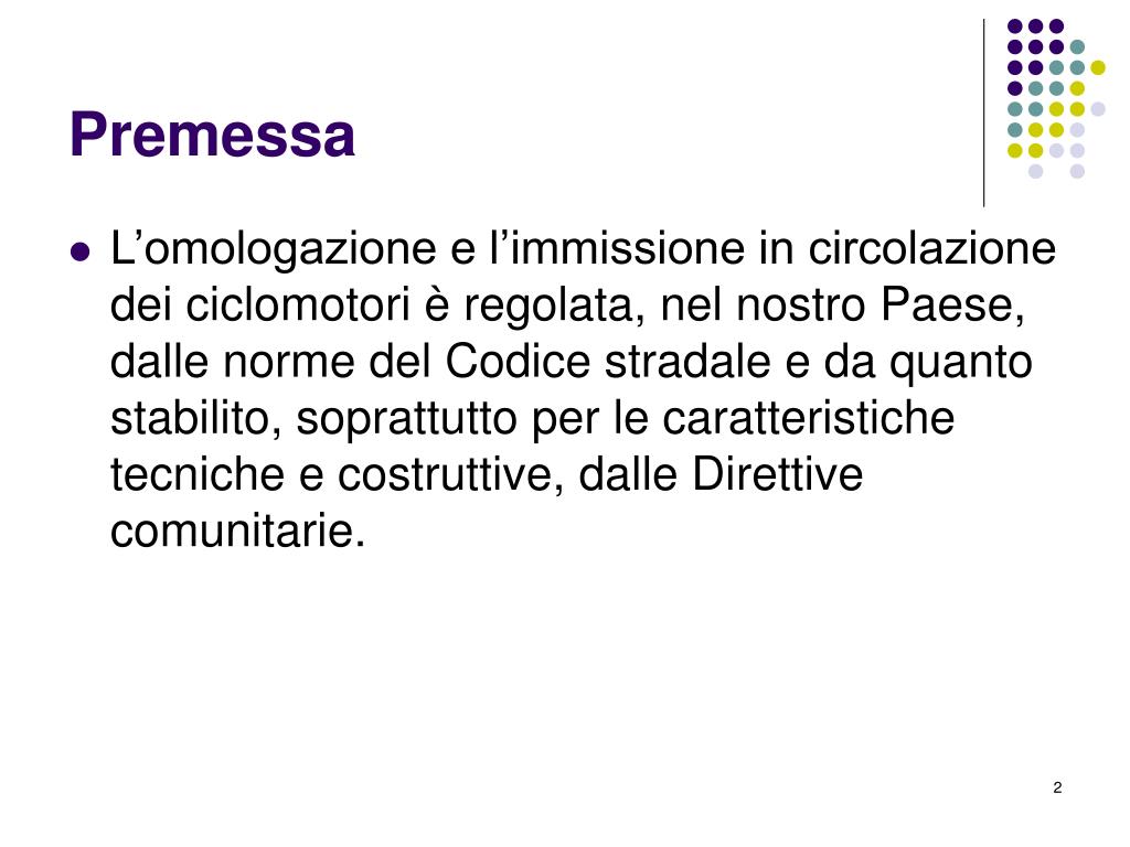 Premessa • L’omologazione e l’immissione in circolazione dei ciclomotori è regolata, nel nostro Paese, dalle norme del Codice stradale e da quanto stabilito, soprattutto per le caratteristiche tecniche e costruttive, dalle Direttive comunitarie.