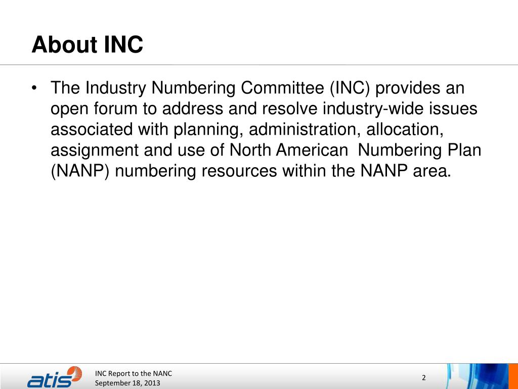 About INC • The Industry Numbering Committee (INC) provides an open forum to address and resolve industry-wide issues associated with planning, administration, allocation, assignment and use of North American Numbering Plan (NANP) numbering resources within the NANP area.