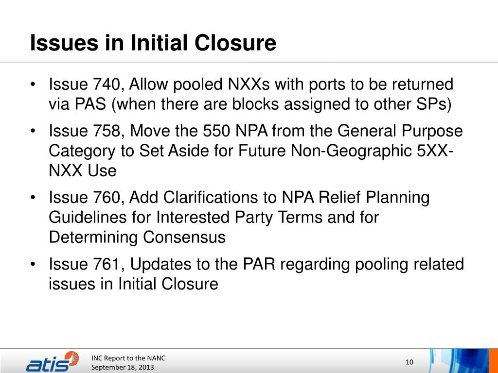 Issues in Initial Closure • Issue 740, Allow pooled NXXs with ports to be returned via PAS (when there are blocks assigned to other SPs) • Issue 758, Move the 550 NPA from the General Purpose Category to Set Aside for Future Non-Geographic 5XX-NXX Use • Issue 760, Add Clarifications to NPA Relief Planning Guidelines for Interested Party Terms and for Determining Consensus • Issue 761, Updates to the PAR regarding pooling related issues in Initial Closure