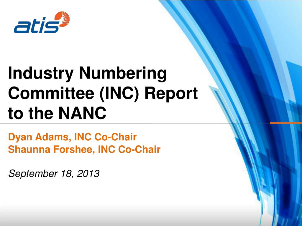 Industry Numbering Committee (INC) Report to the NANC • Dyan Adams, INC Co-Chair • Shaunna Forshee, INC Co-Chair • September 18, 2013