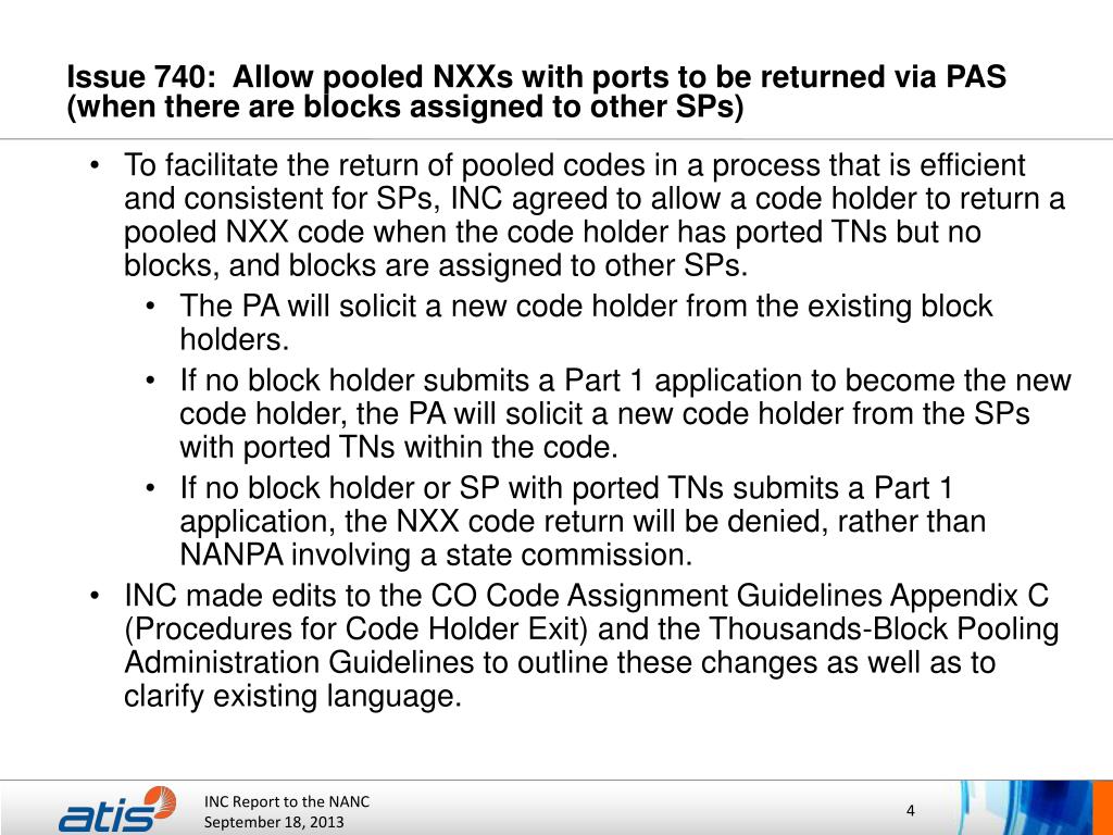 Issue 740: Allow pooled NXXs with ports to be returned via PAS (when there are blocks assigned to other SPs) • To facilitate the return of pooled codes in a process that is efficient and consistent for SPs, INC agreed to allow a code holder to return a pooled NXX code when the code holder has ported TNs but no blocks, and blocks are assigned to other SPs. • The PA will solicit a new code holder from the existing block holders. • If no block holder submits a Part 1 application to become the new code holder, the PA will solicit a new code holder from the SPs with ported TNs within the code. • If no block holder or SP with ported TNs submits a Part 1 application, the NXX code return will be denied, rather than NANPA involving a state commission. • INC made edits to the CO Code Assignment Guidelines Appendix C (Procedures for Code Holder Exit) and the Thousands-Block Pooling Administration Guidelines to outline these changes as well as to clarify existing language.