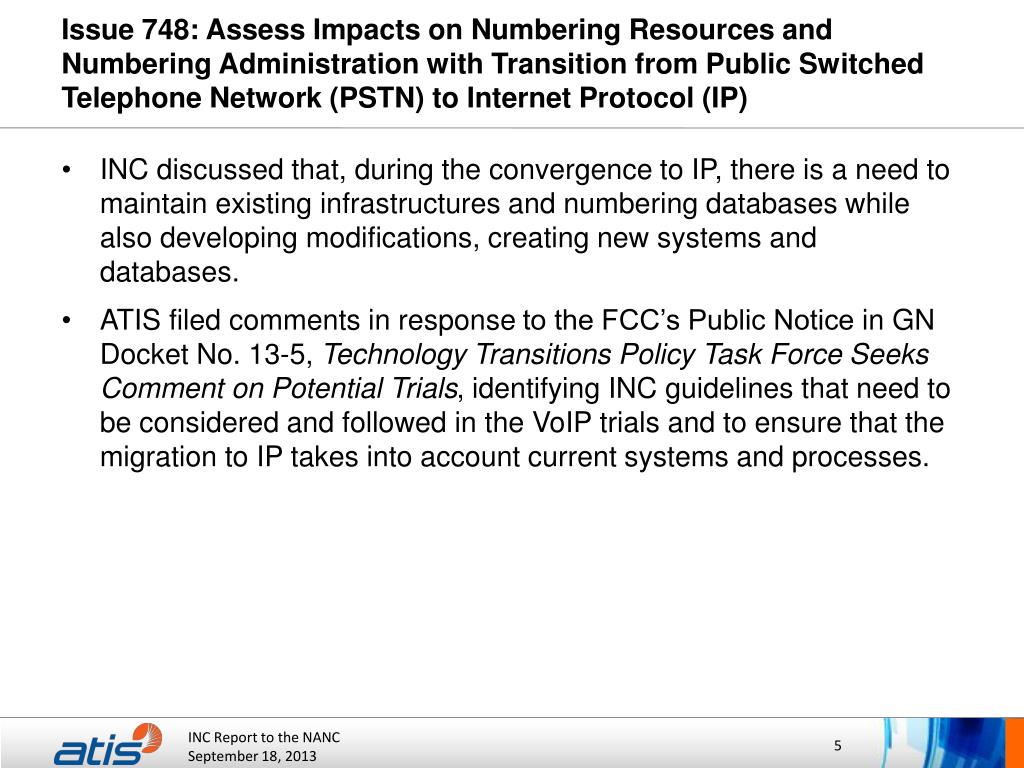 Issue 748: Assess Impacts on Numbering Resources and Numbering Administration with Transition from Public Switched Telephone Network (PSTN) to Internet Protocol (IP) • INC discussed that, during the convergence to IP, there is a need to maintain existing infrastructures and numbering databases while also developing modifications, creating new systems and databases. • ATIS filed comments in response to the FCC’s Public Notice in GN Docket No. 13-5, Technology Transitions Policy Task Force Seeks Comment on Potential Trials, identifying INC guidelines that need to be considered and followed in the VoIP trials and to ensure that the migration to IP takes into account current systems and processes.