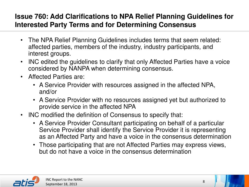 Issue 760: Add Clarifications to NPA Relief Planning Guidelines for Interested Party Terms and for Determining Consensus • The NPA Relief Planning Guidelines includes terms that seem related: affected parties, members of the industry, industry participants, and interest groups. • INC edited the guidelines to clarify that only Affected Parties have a voice considered by NANPA when determining consensus. • Affected Parties are: • A Service Provider with resources assigned in the affected NPA, and/or • A Service Provider with no resources assigned yet but authorized to provide service in the affected NPA • INC modified the definition of Consensus to specify that: • A Service Provider Consultant participating on behalf of a particular Service Provider shall identify the Service Provider it is representing as an Affected Party and have a voice in the consensus determination • Those participating that are not Affected Parties may express views, but do not have a voice in the consensus determination