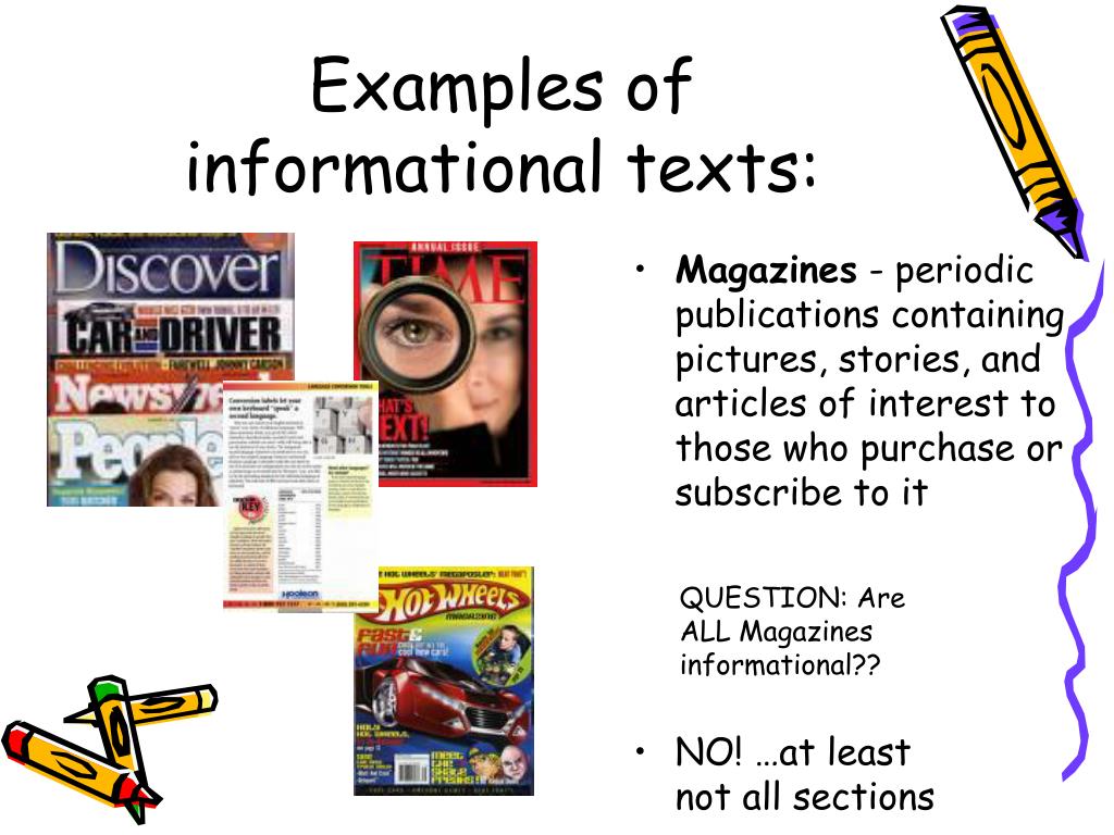 NO! …at least not all sections Magazines - periodic publications containing pictures, stories, and articles of interest to those who purchase or subscribe to it Examples of informational texts: QUESTION: Are ALL Magazines informational??