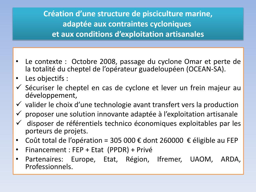 Création d’une structure de pisciculture marine, adaptée aux contraintes cycloniques et aux conditions d’exploitation artisanales • Le contexte : Octobre 2008, passage du cyclone Omar et perte de la totalité du cheptel de l’opérateur guadeloupéen (OCEAN-SA). • Les objectifs : • Sécuriser le cheptel en cas de cyclone et lever un frein majeur au développement, • valider le choix d’une technologie avant transfert vers la production • proposer une solution innovante adaptée à l’exploitation artisanale • disposer de référentiels technico économiques exploitables par les porteurs de projets. • Coût total de l’opération = 305 000 € dont 260000 € éligible au FEP • Financement : FEP + Etat (PPDR) + Privé • Partenaires: Europe, Etat, Région, Ifremer, UAOM, ARDA, Professionnels.